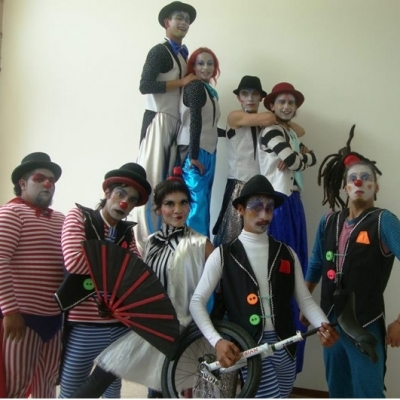 Compuesta por un número de 6 a 9 artistas de nuestra compañía clown, entre los que se destacan dos músicos y representantes de las más vistosas disciplinas circenses como rola, jirafas, contac, clavas (de luz, antorchas, machetes, sombreros), pulsadas...